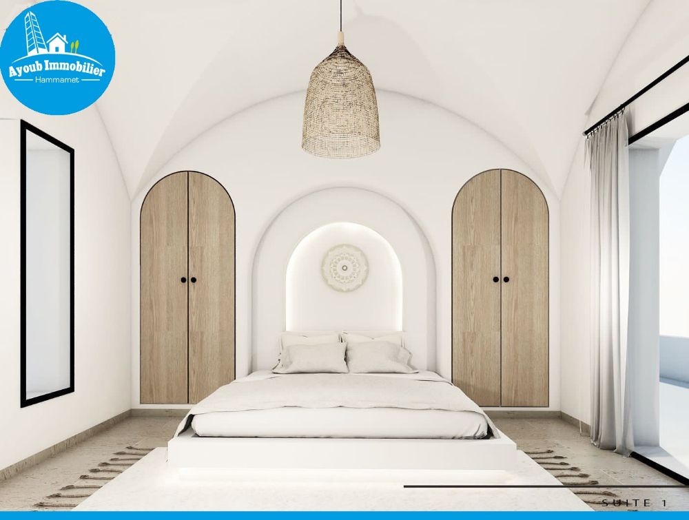 Une demeure de luxe à vendre à Hammamet zone monchar, elle fait 700m² de surface dont 235m² couvert,elle se compose d'un grand salon ouvrant sur une piscine débordante et ensoleillée ,4 suites avec des voutes croisées ,une salle d'eau pour les invités et une kitchenette équipée avec un coin de repas.Quand à l'étage on trouve un studio totalement indépendant avec une vue splendide sur la mer. La villa bénéficie aussi d'un abri pour 3 voitures .Prix:890.000DT.