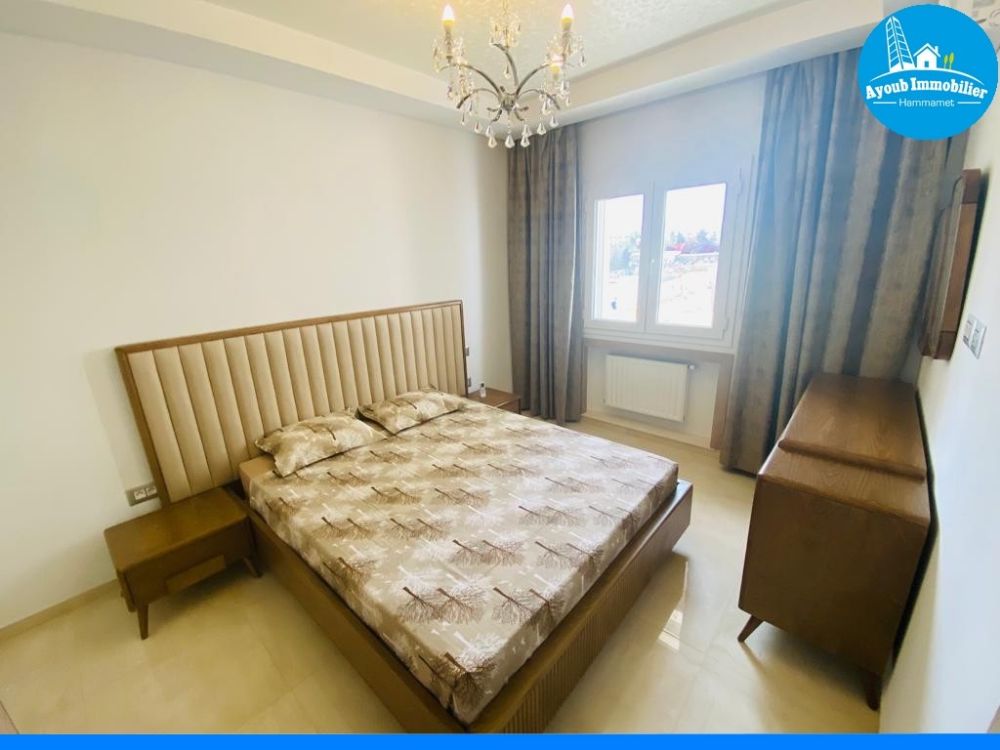 Bel appartement à louer à Hammamet. Il se compose d'un salon donnant sur une terrasse, une suite parentale avec une salle de douche, une chambre, une salle de bain et une une kitchenette équipée . L'appartement est totalement chauffé et climatisé, il bénéficie d'une place de parking au sous-sol et d'une piscine commune. L'ascenseur et le Wi-Fi sont aussi disponibles. Prix :1800dt par mois .