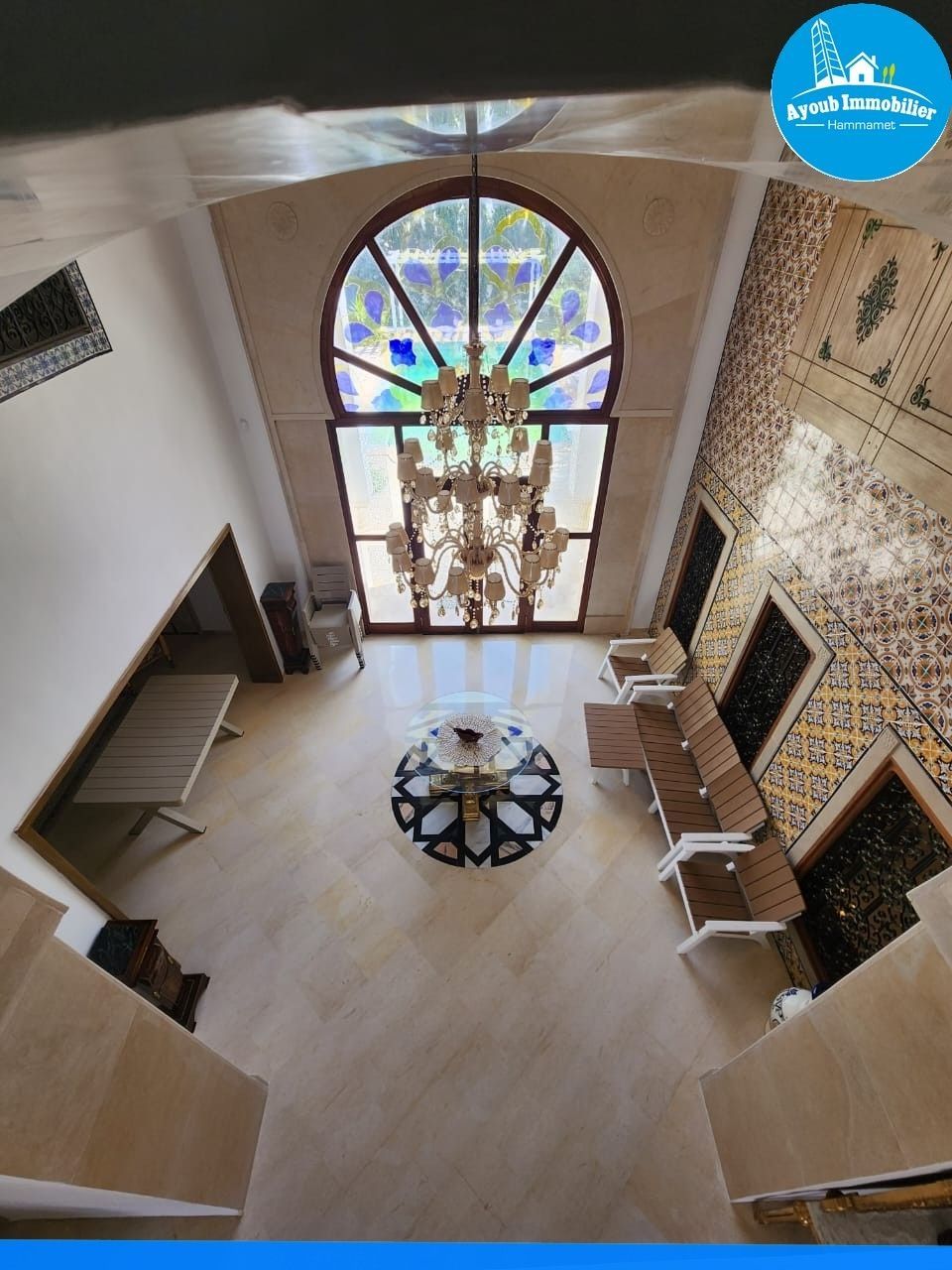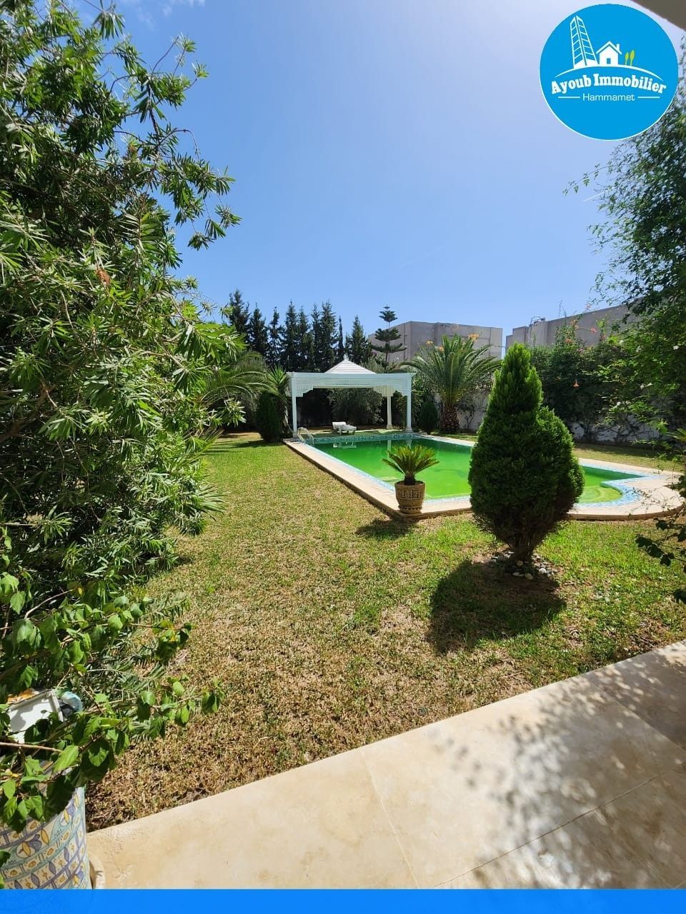 Une Villa à louer pour des courtes durées à 3 km de Hammamet Sud,où on trouve au RDC un salon donnant sur une piscine de 12 m, une cuisine richement meublée , un séjour ,une salle de douche et Hammam.Quand à l'étage on trouve 4 suites chacune donnant sur une terrasse et un deuxième séjour .Un grand jardin et une un abri pour 2 voitures sont aussi disponibles. Prix 7000dt/semaine