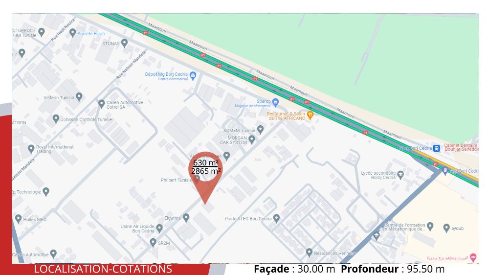 À seulement 20 min du port de Radès, dans la zone industrielle de Borj-Cédria, découvrez ce bâtiment industriel de 630 m² édifié sur un terrain titré de 2865 m². Situé en zone non polluante, entièrement clôturé et très accessible, il représente une opportunité clé en main pour les investisseurs.