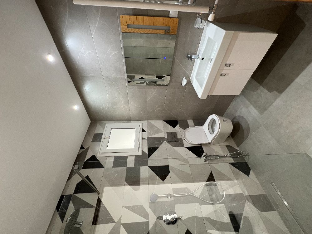 Revêtements de sol : marbre blanc au salon et grès dans la masse 1er choix pour la cuisine et la salle de bain.