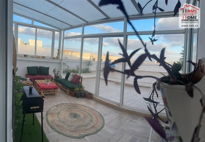 Un penthouse de luxe situé au 5éme étage à Enasser. A L’entrée, On trouve un salon, une cuisine équipée, deux chambres , un salles de bain et une terrasse grande terrasse avec une partie avec baie vitré. Contacter Agent: 58790420.