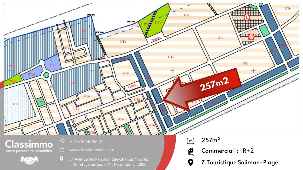 Situé au cœur de la zone touristique de Soliman Plage, ce terrain d’angle de 257 m² représente une opportunité rare pour un projet résidentiel ou un investissement à vocation commerciale.