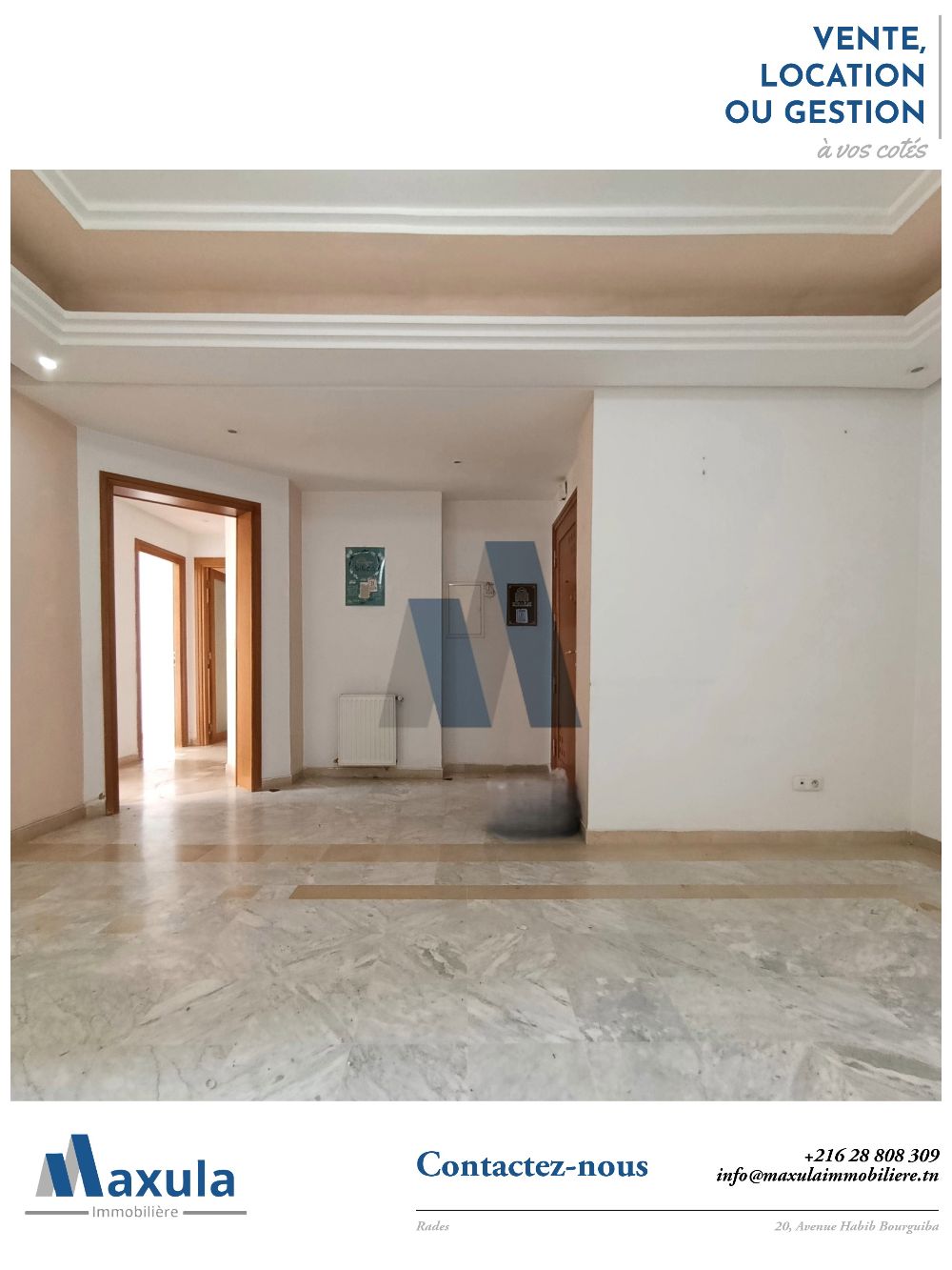 🔹MAXULA IMMOBILIERE vous propose à la LOCATION un APPARTEMENT S+2 d’environ 75m², situé au 2ème étage sans ascenseurs de la RÉSIDENCE TURQUOISE, idéalement placée à l’angle des AVENUES HABIB BOURGUIBA et TAIEB MHIRI à RADES.